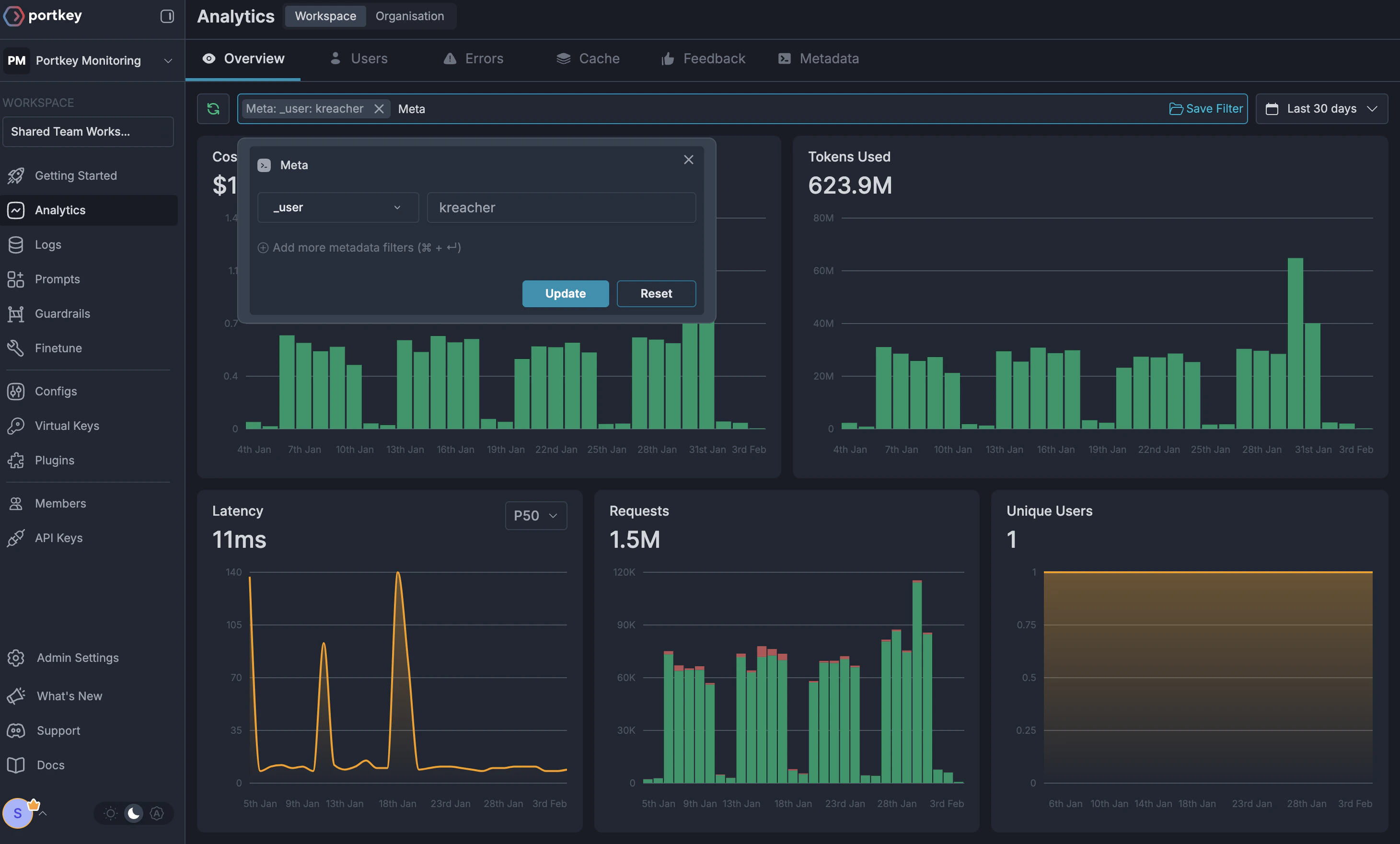 1. Portkey Dashboard: Use metadata filters to analyze costs visually.