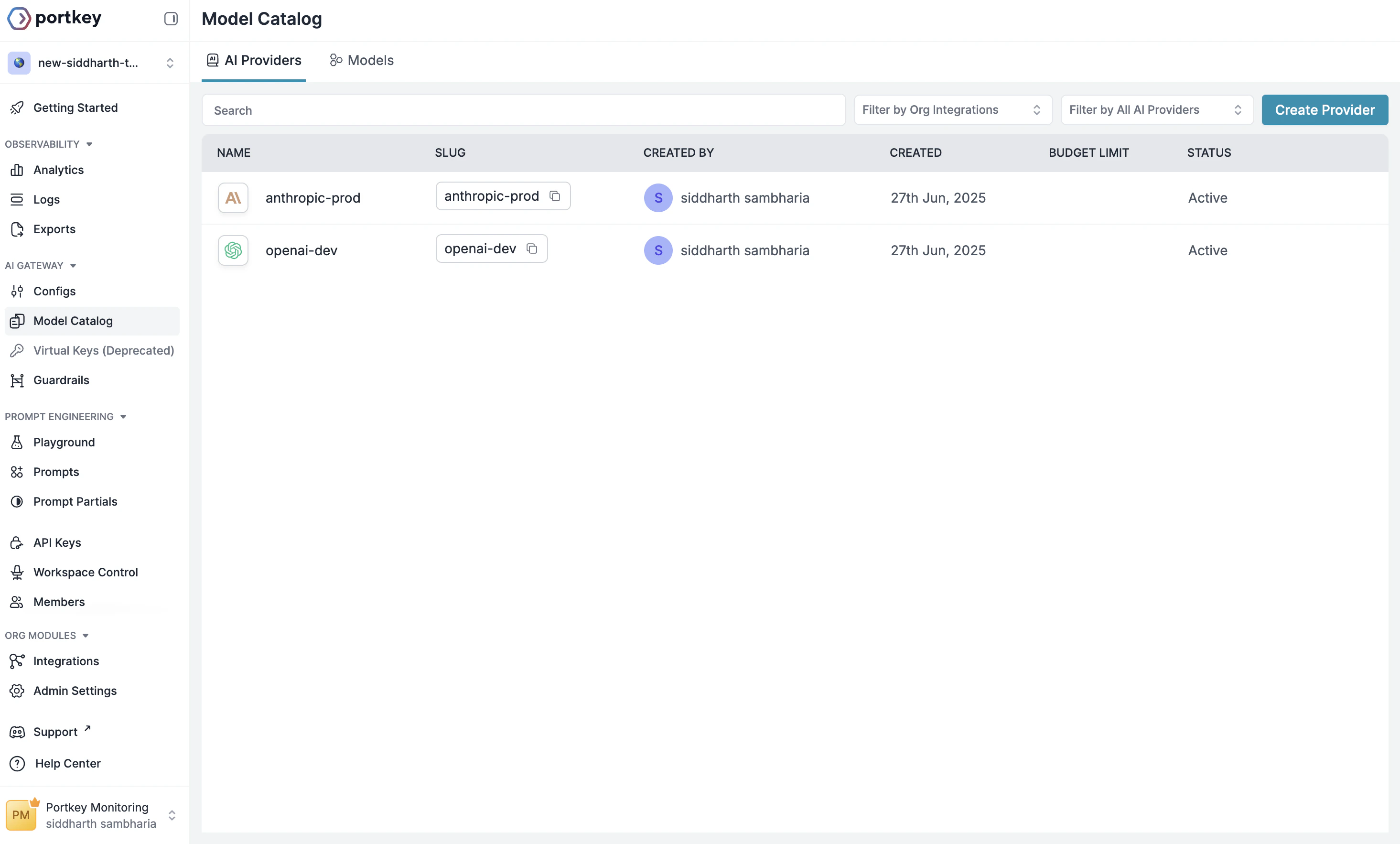 • Portkey API Key & Portkey AI Provider slug from Step 1
