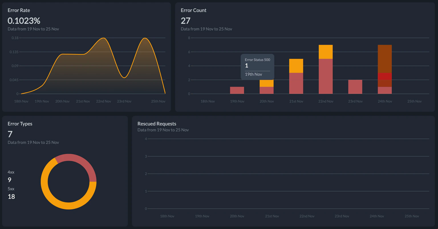 Portkey captures errors automatically for API and Accuracy errors. The charts give you a quick sense of error rates allowing you to debug further when needed. The dashboard also shows you the number of requests rescued by Portkey through the various AI gateway strategies.