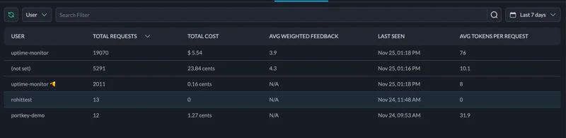 The users tab provides an overview of the user information associated with your Portkey requests. This data is derived from the user parameter in OpenAI SDK requests or the special _user key in the Portkey metadata header. Portkey currently does not provide analytics on usage patterns for individual team members in your Portkey organization. The users tab is designed to track end-user behavior in your application, not internal team usage.