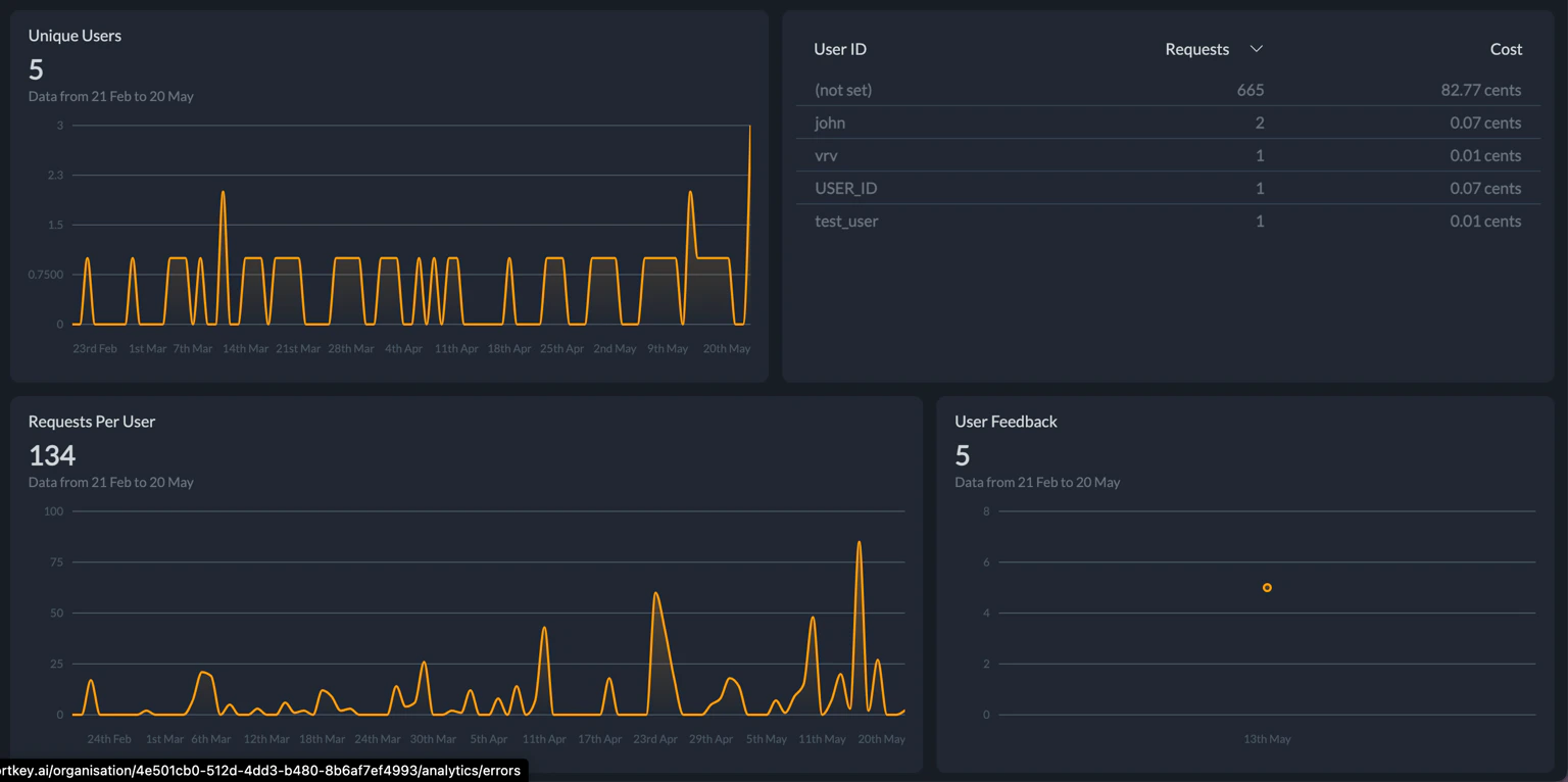 The dashboard provides insights into your users, errors, cache, feedback and also summarizes information by metadata.