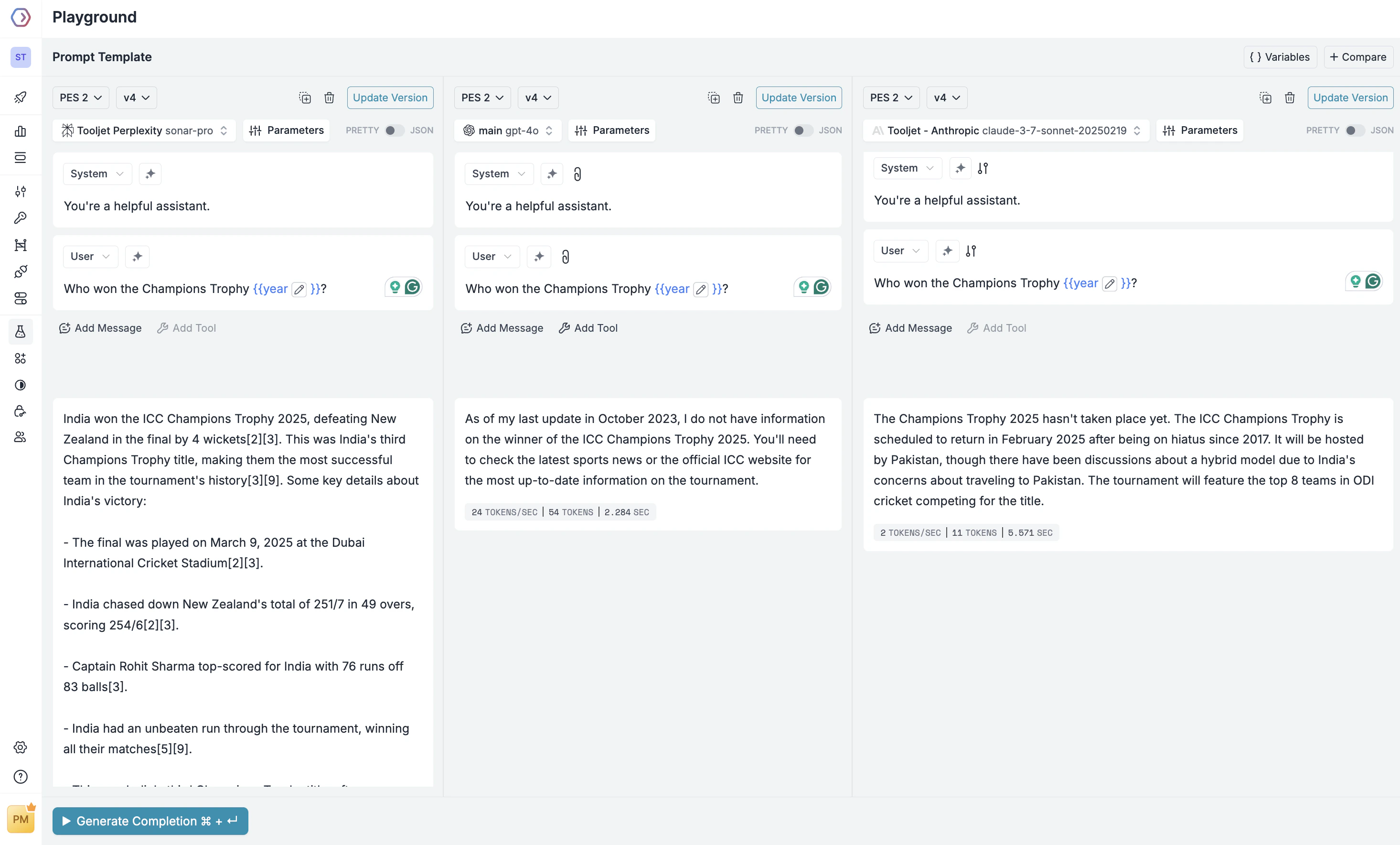 Wondering which model works best for your use case? The side-by-side comparison feature lets you see how different models handle the same prompt. Click the ”+ Compare” button to add another column, select a different model, and generate completions simultaneously. You will be able to see how each model responds to the same prompt, along with crucial metrics like latency, total tokens, and throughput helping you make informed decisions about which model to use in production. You can run comparisons on the same prompt template by selecting the template from the “New Template” dropdown in the UI along with the versions button across multiple models. Once you figure out what is working, you can click on the “Update Prompt” button to update the prompt template with a new version. You can also compare different prompt versions by selecting the version from the UI. The variables you define apply across all templates in the comparison, ensuring you’re testing against identical inputs.