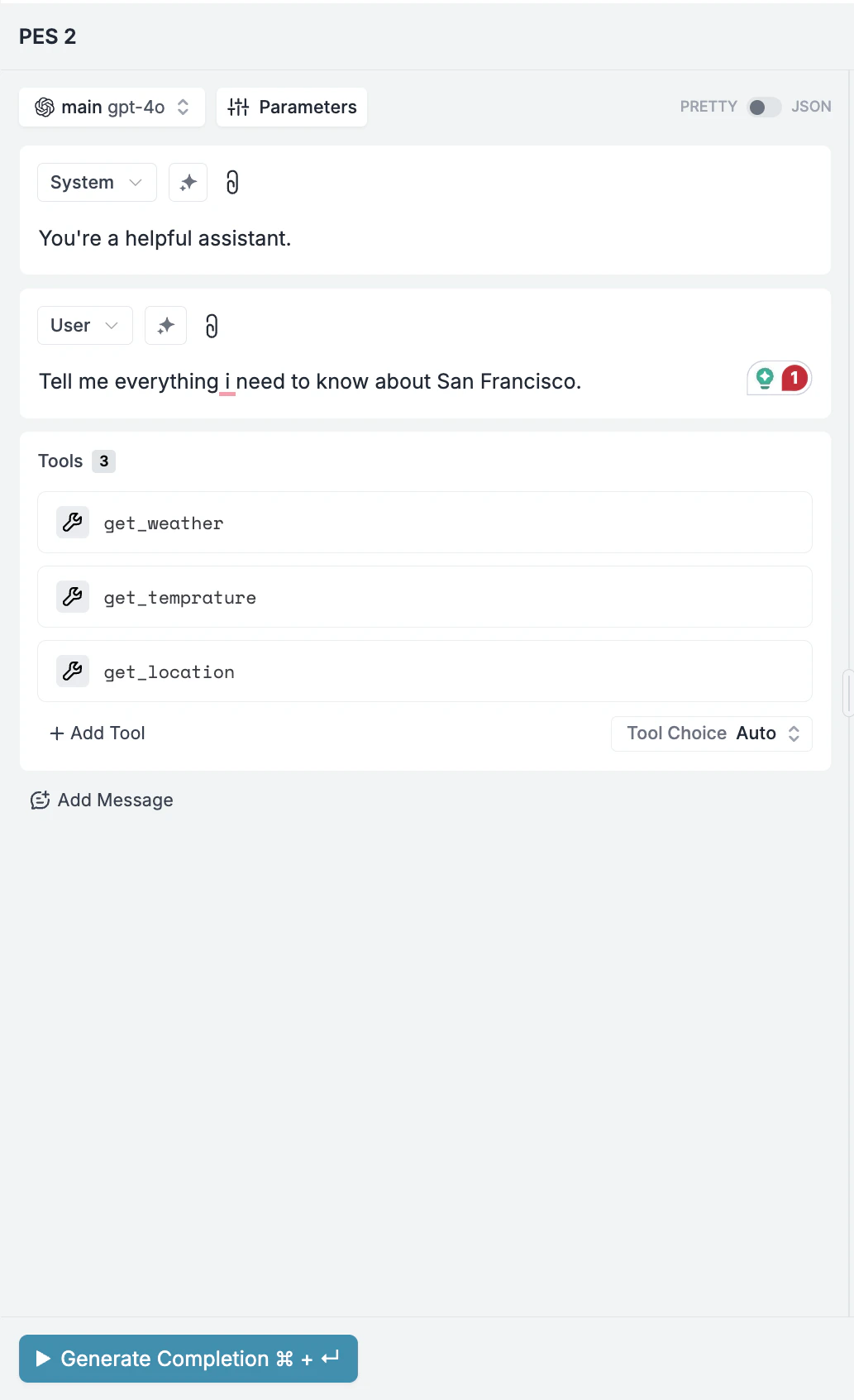 Some models support function calling, allowing the AI to request specific information or take actions. The Playground makes it easy to experiment with these capabilities. Click “Add Tool” button to define functions the model can call. For example: